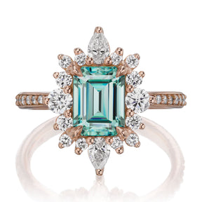 Emerald Cut Aqua-Teal Iconic™ Moissanite Center, Diamond Halo