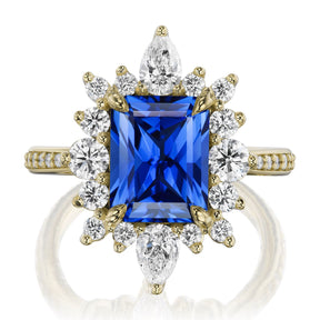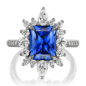 The vintage-inspired large Talia makes a statement engagement ring or treat-yourself gift. Featuring a radiant cut Chatham® lab-grown blue sapphire center, accented by conflict-free lab-grown diamonds. The Talia is as ethical as it is sparkling.