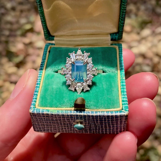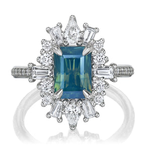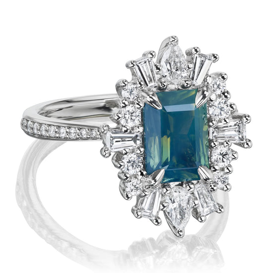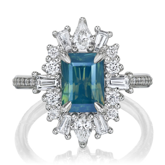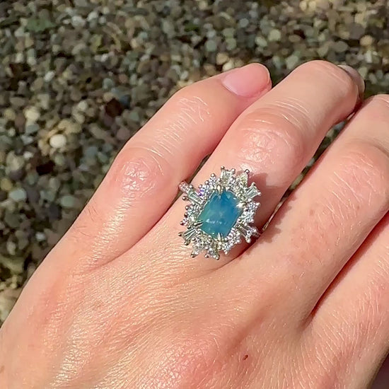 Radiant Opalescent Teal Sapphire Center, Diamond Halo