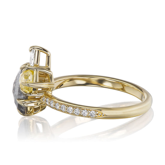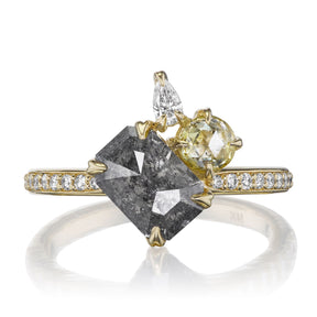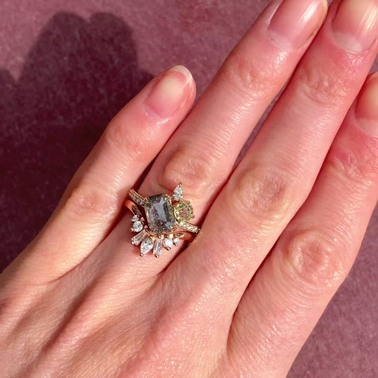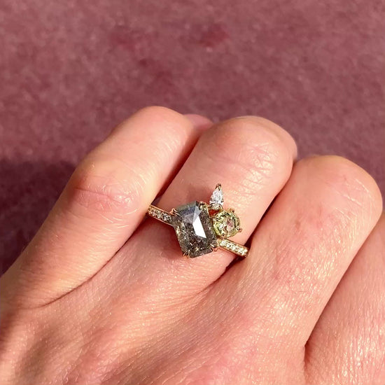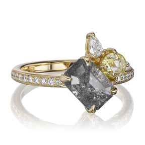 The Tribeca makes the perfect engagement ring or treat-yourself gift. Our take on the Toi et Moi cluster style, featuring an emerald shape salt + pepper diamond, accented by a round rose-cut yellow diamond, plus a white pear diamond. Framed by a trail of conflict-free diamonds in the shank. This ring is truly one-of-a-kind, so snag it while you can!