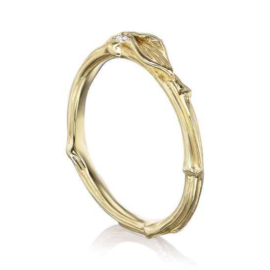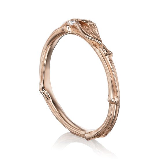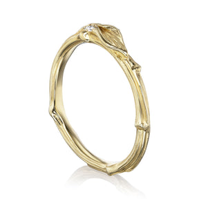 Real twigs were molded and cast, then adorned with hand-sculpted leaves. It's dotted by a single conflict-free, sparkling diamond dew drop. Cast in your choice of solid recycled gold or platinum. Beautiful on its own or as a wedding band, or wear it alongside your favorite rings to create your own unique, stackable collection.