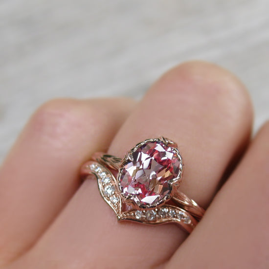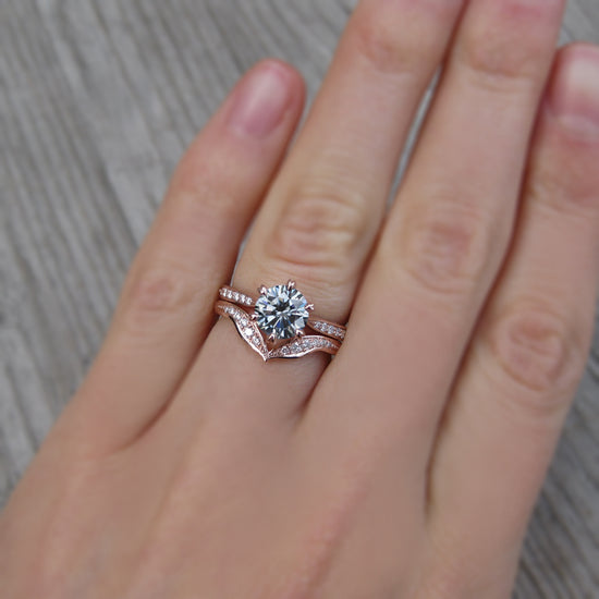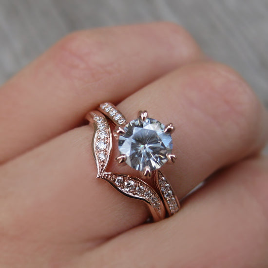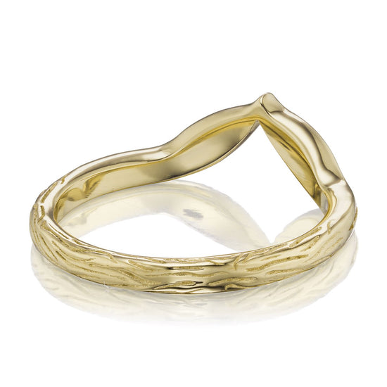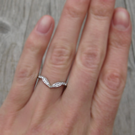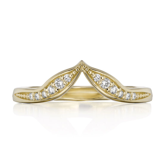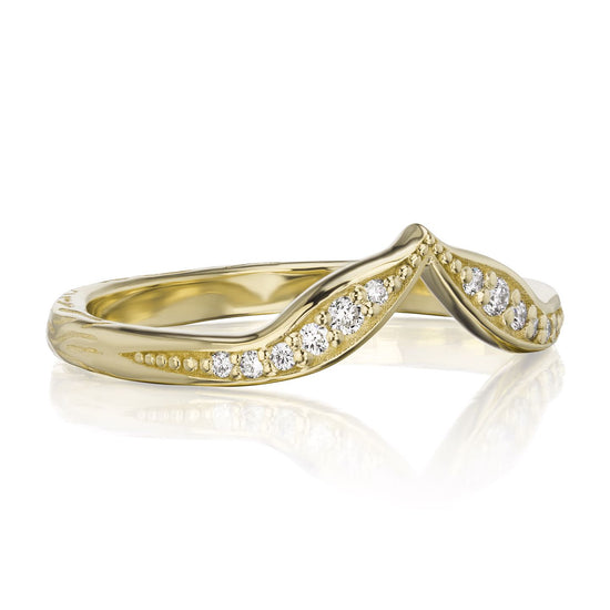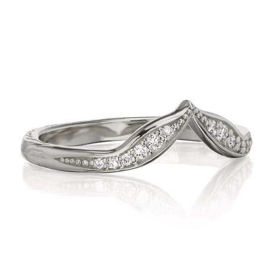 A leaf-inspired chevron band is dotted by a trail of pavé set conflict-free lab-grown or Canadian mined diamonds. Beautiful paired with a variety of solitaire engagement rings, or wear it alongside your favorite rings to create your own unique, stackable collection.