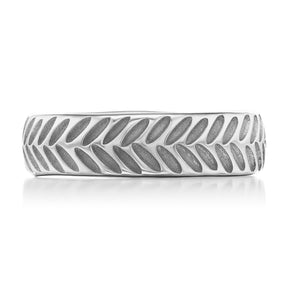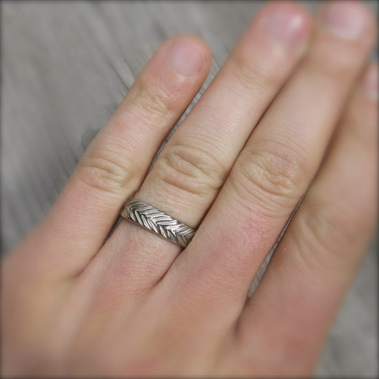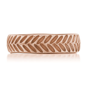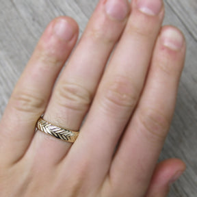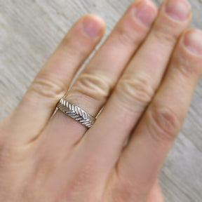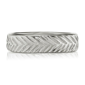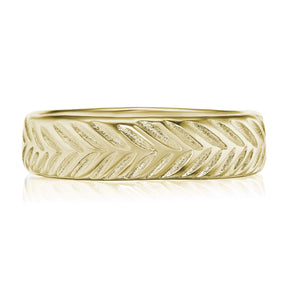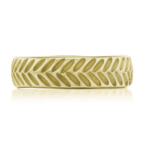 This wide band was inspired by vintage feather motifs. Rustic and substantial in weight, this band will last for generations.
