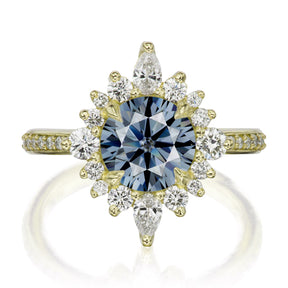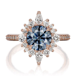 The vintage-inspired midsize Zahra makes a statement engagement ring or treat-yourself gift. Featuring a Hearts & Arrows grey Iconic™ moissanite center, accented by conflict-free lab-grown diamonds. The Zahra is as ethical as it is sparkling.